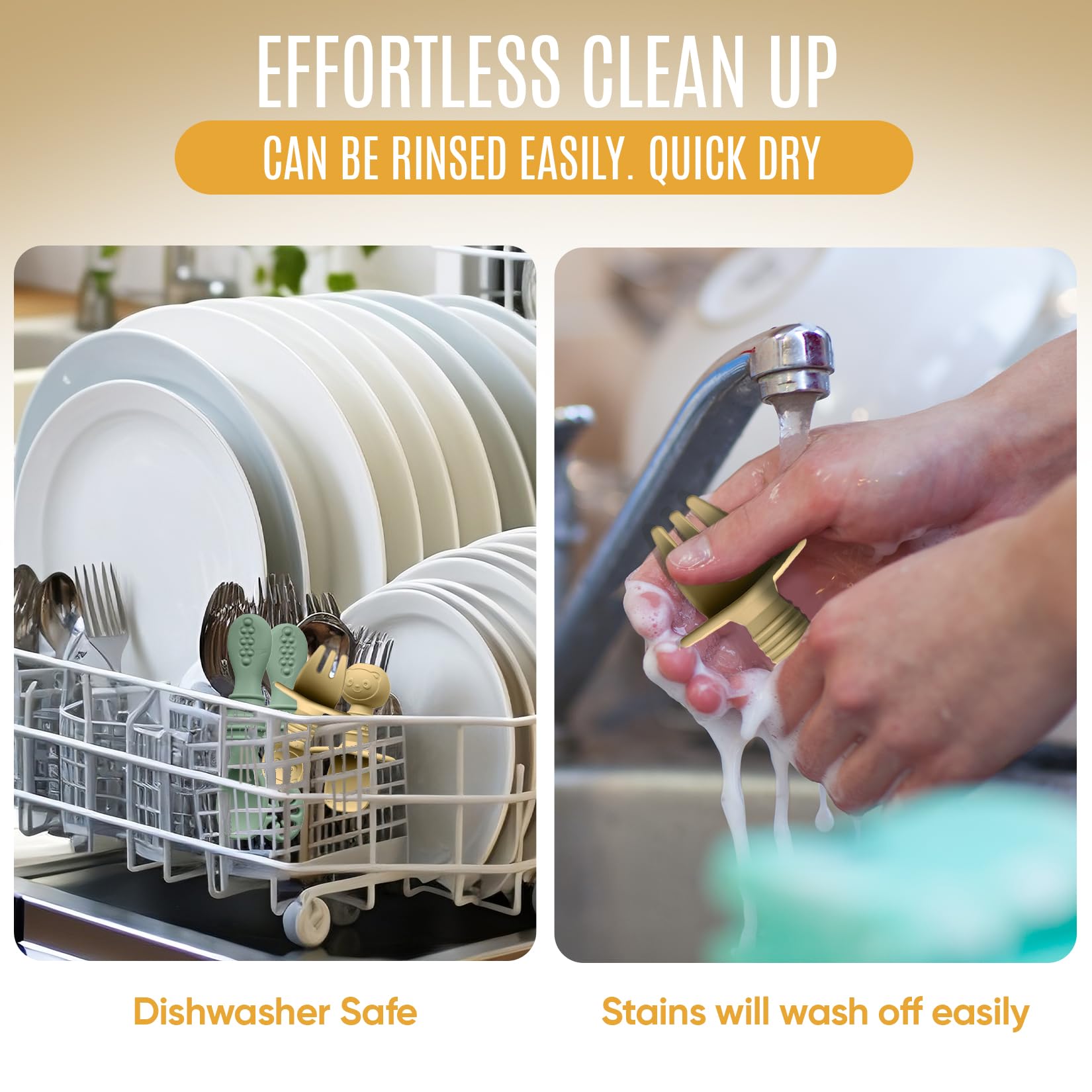 - EFFORTLESS CLEAN-UP: Made of high-quality food-grade silicone material, our baby silicone feeding set is very easy to clean up and will leave no stains. Simply, place the set in the dishwasher and they will come out clean and sanitized. These toddler spoons and forks are also lightweight and easy to hold, making it perfect for on-the-go meals.