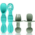 - COMPLETE BABY EATING UTENSILS: HippoBaby 4 Piece baby led weaning spoon and fork set is a great way to encourage your baby to develop healthy eating habits and to promote independence. This kids utensil set is made out of high-quality silicone material and is designed to last for years. The set comes with 1 pre-stage infant feeding spoon and 1 baby fork, 1 Stage-1 and Stage-2 spoons. The set is designed to promote independent eating and is ideal for babies and toddlers who are starting to explore different textures and flavors.