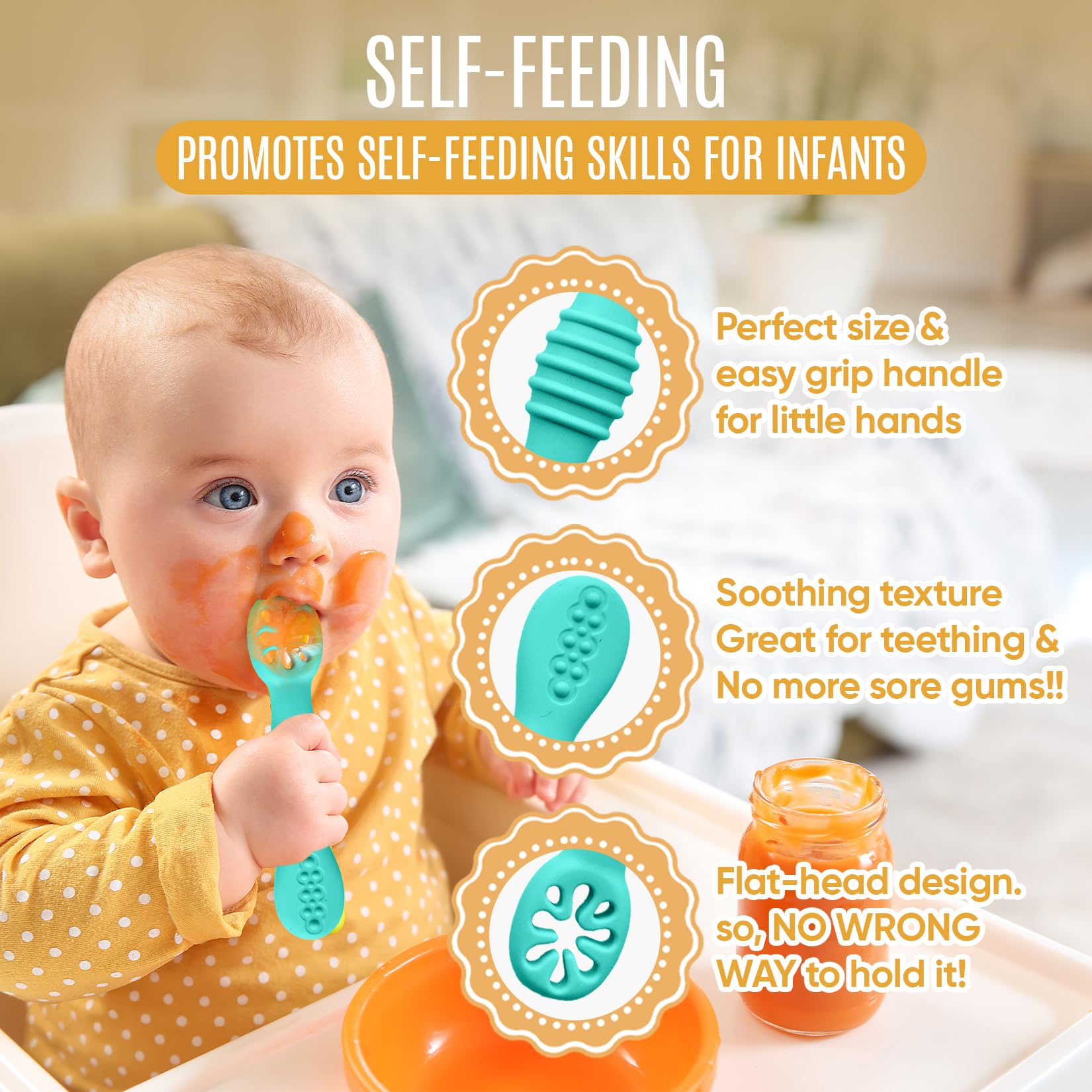 - PROMOTES SELF FEEDING: Our baby self feeding utensils include a fork with a curved edge that is perfect for scooping up food, and a small spoon with a rounded tip that is ideal for feeding your baby soft and smooth foods. The silicone slotted spoon is ideal for pre-stage feeding. The channeled side of this silicone spoon will hold purees and solid food easily. Thanks to its flat design so THERE IS NO WRONG WAY to hold the spoon, so your little one can enjoy new food textures and flavors.