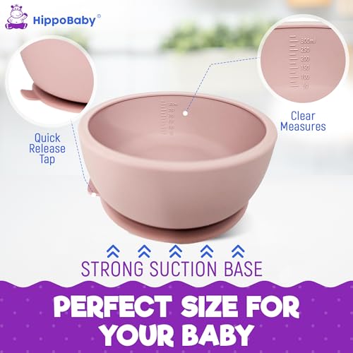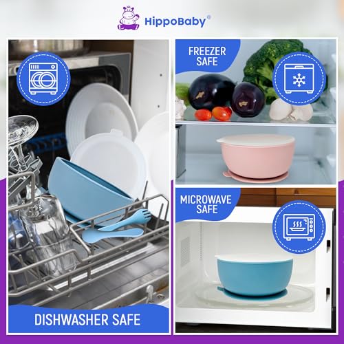 - ENHANCE SELF-FEEDING – Make mealtimes a breeze with HippoBaby suction bowls and baby self feeding spoon & fork set at home or on the go. This silicone baby feeding set encourages your child's independence at mealtime. It includes one 12 oz suction bowl with lid, 1 Bib, 2 Baby Spoons, 1 Large Spoon, 1 Large Fork, Baby Feeding Essentials.