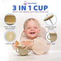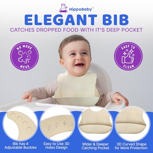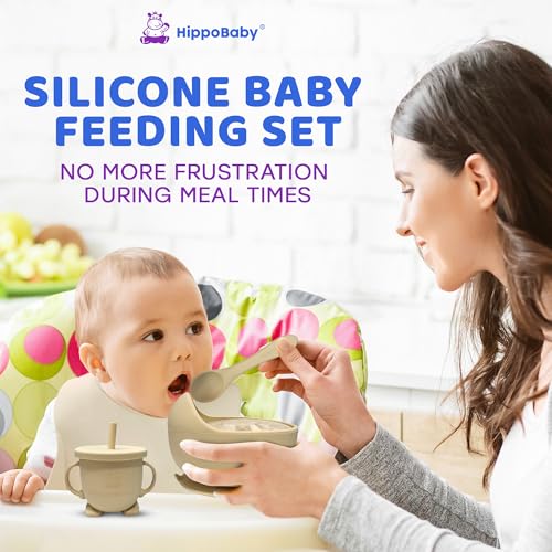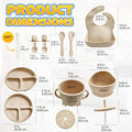 - COMPLETE BABY SILICONE FEEDING SET: Our baby weaning set for baby comes with everything to help your little one to transition to eating independently. The baby eating supplies includes 1 baby suction tray plate with dividers, 1 suction bowl, 1 adjustable bib with food catcher, 1 sippy cup with straw and lid, 1 snack cup lid, 1 spoon, 1 fork, 1 baby spoon, 1 baby fork and 1 cleaning stick. The baby feeding supplies are easy for your baby’s little hands to grab and eat with, keeping mealtime pleasant and less messy!