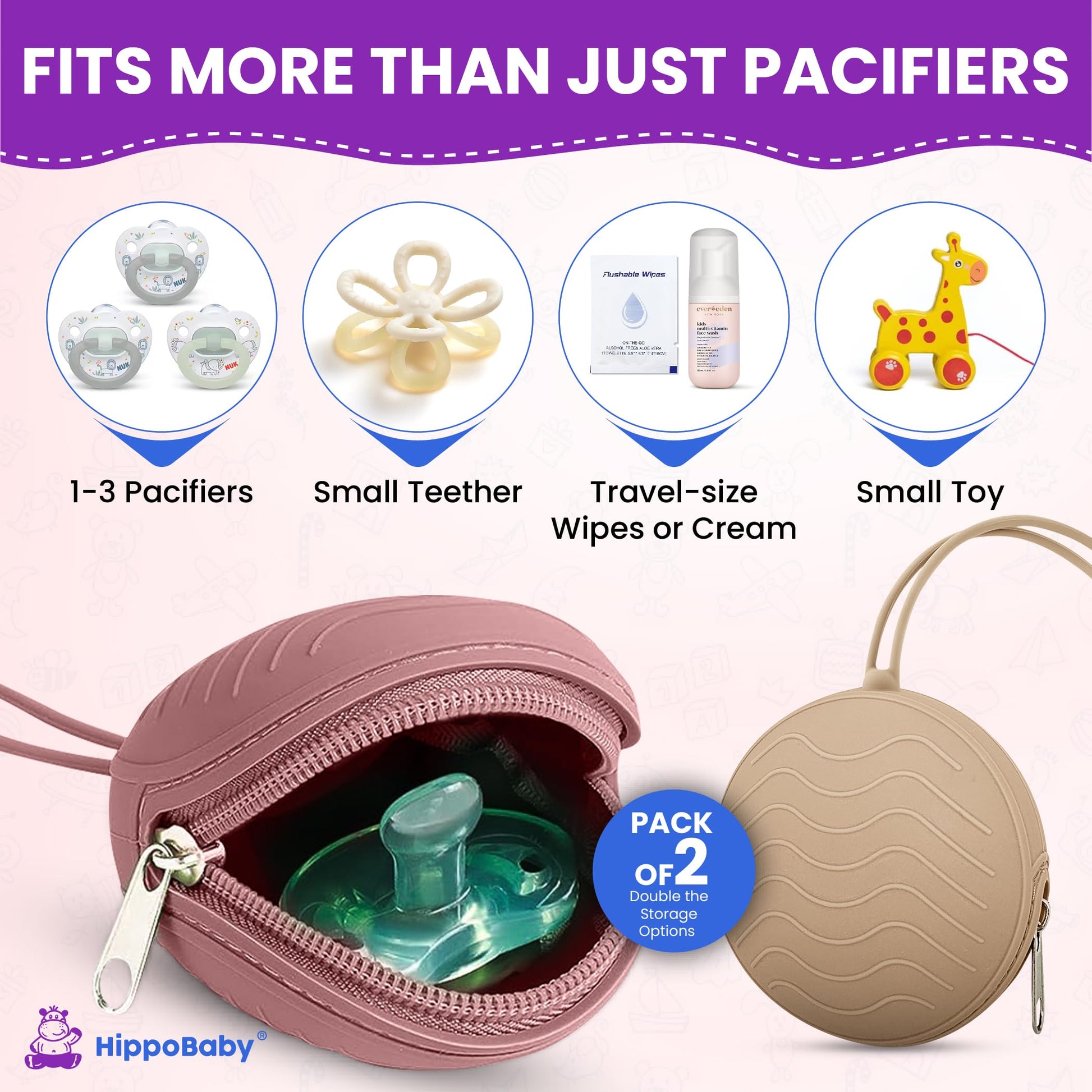 HippoBaby Silicone Pacifier Holder Case 2-Pack – BPA-Free, Food-Grade Silicone – Zippered Travel Pacifier Organizer – Portable Baby Case for Pacifiers, Teethers & Essentials – Dishwasher Safe