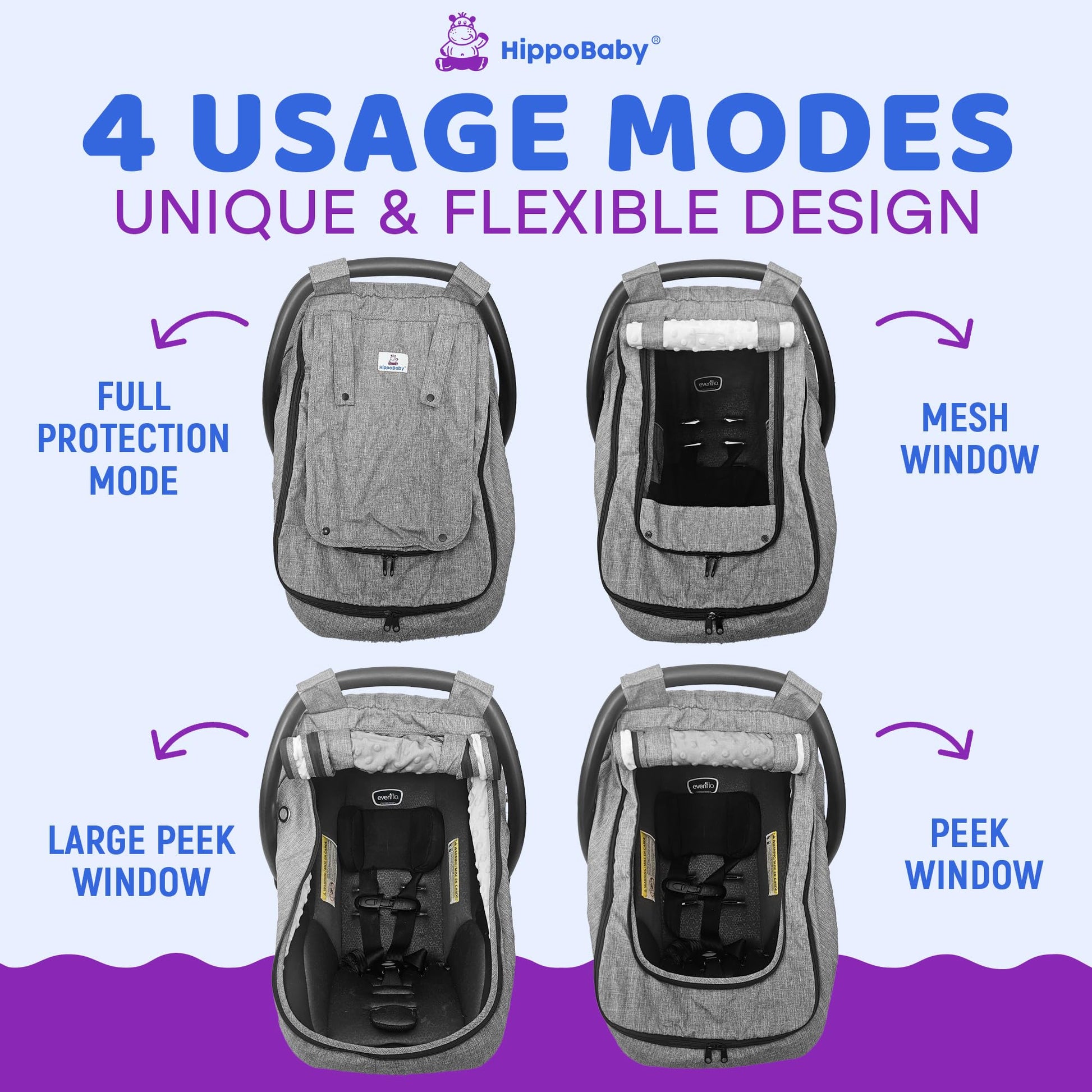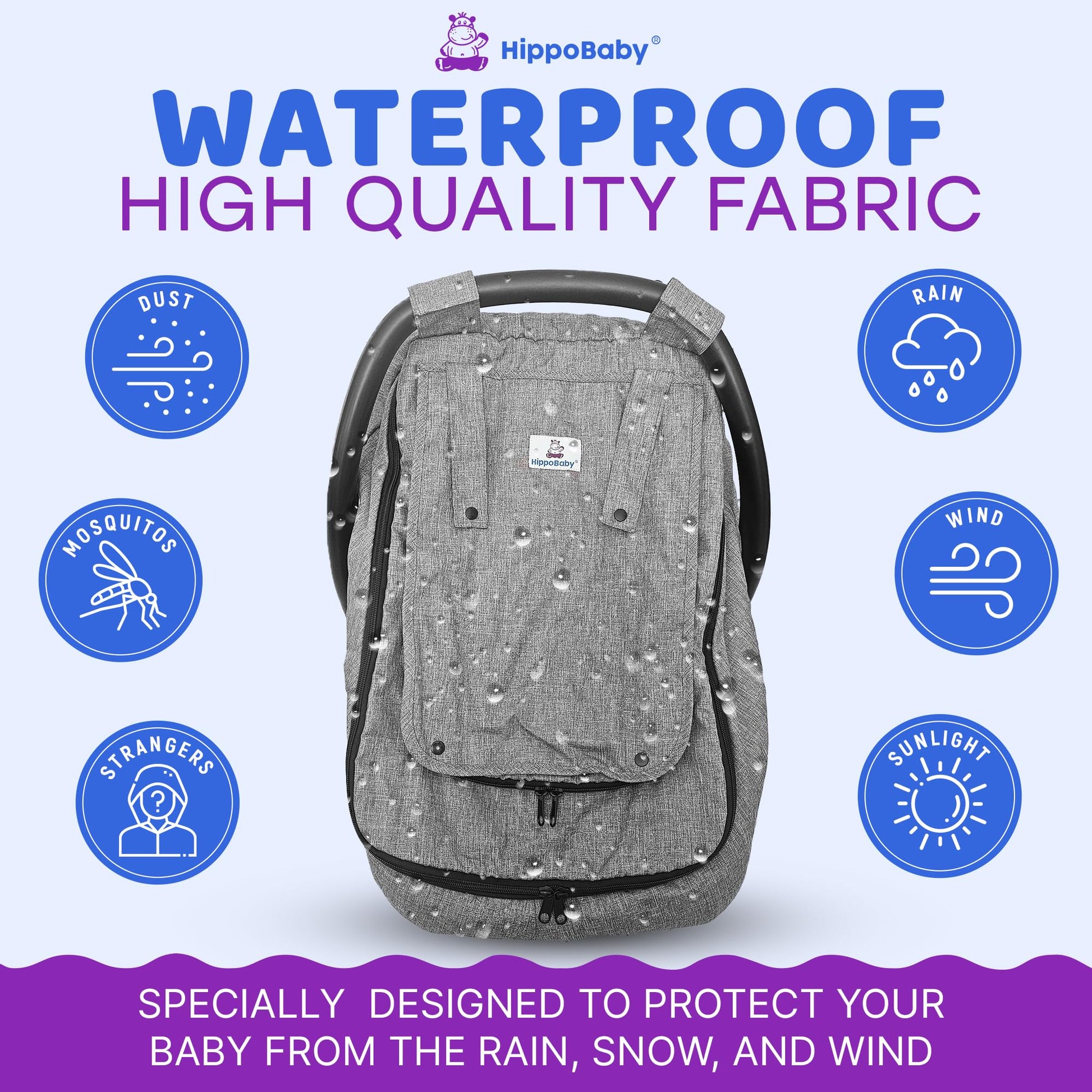 - Superior Weather Protection - HippoBaby waterproof baby car seat cover is constructed from a high-quality, durable waterproof outer fabric. This ensures your baby stays dry and comfortable, shielding them effectively from rain, snow, sleet, and other wet weather conditions. The fabric's tight weave provides excellent wind resistance, preventing chills and maintaining a cozy temperature inside the car seat. This waterproof carseat cover is designed for year-round use, providing protection not just from wet weather, but also from light wind and cooler temperatures.
